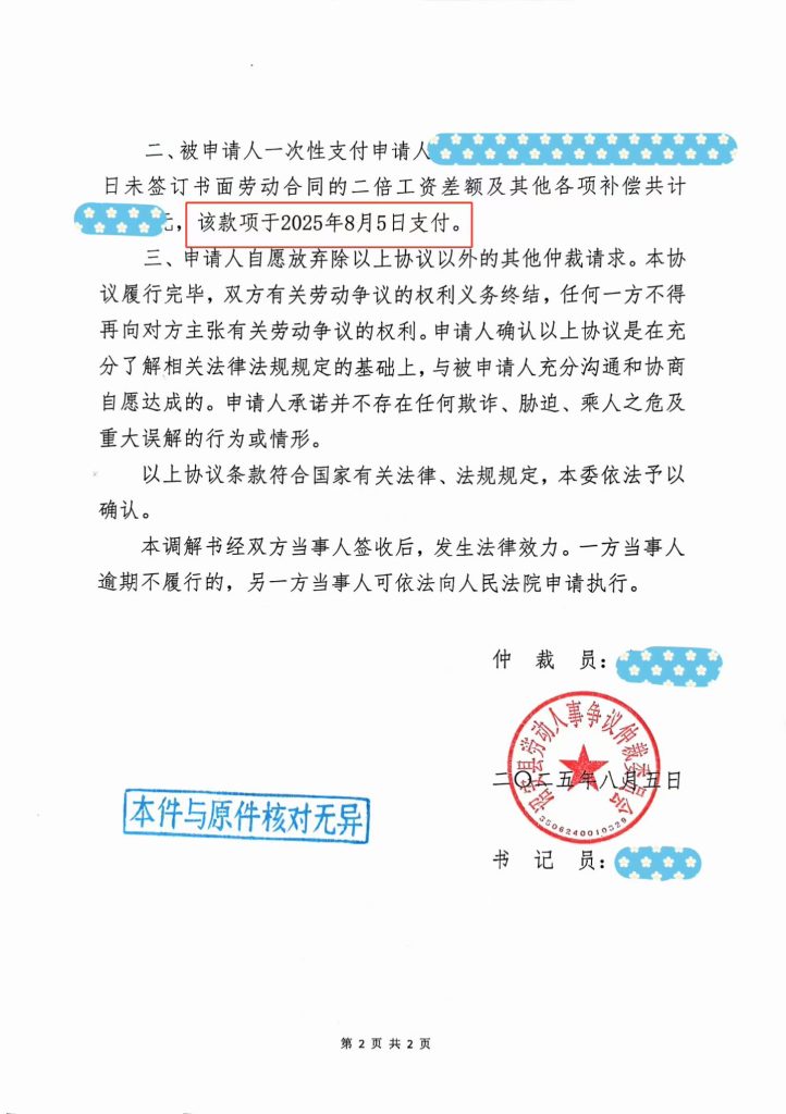 【劳动维权】2025年8月5日,为劳动者维权,争取了二倍工资差额和其他各项补偿: